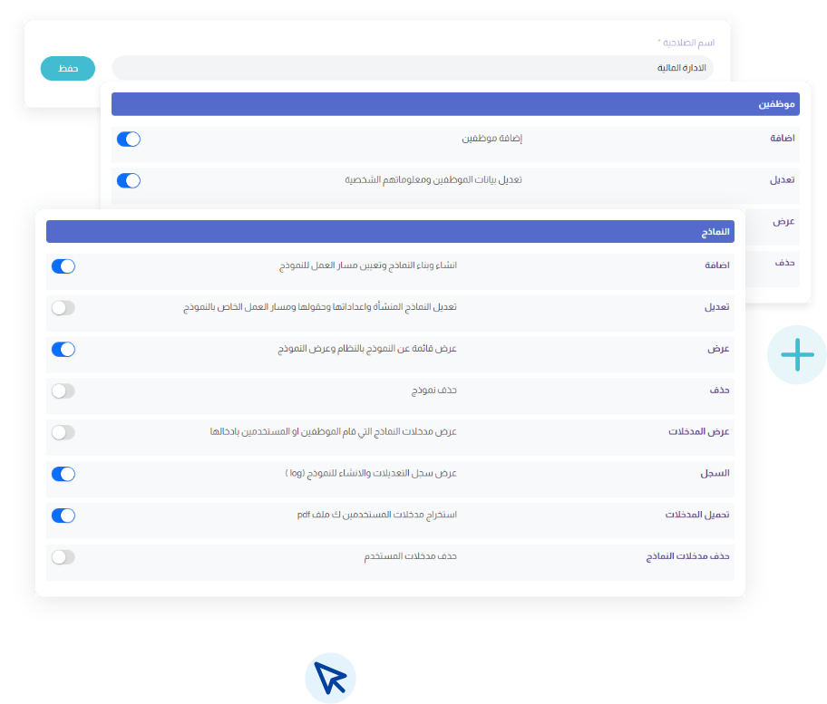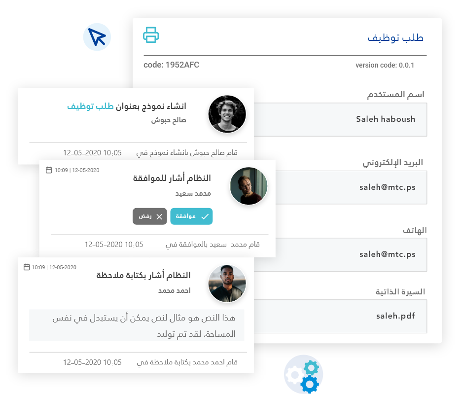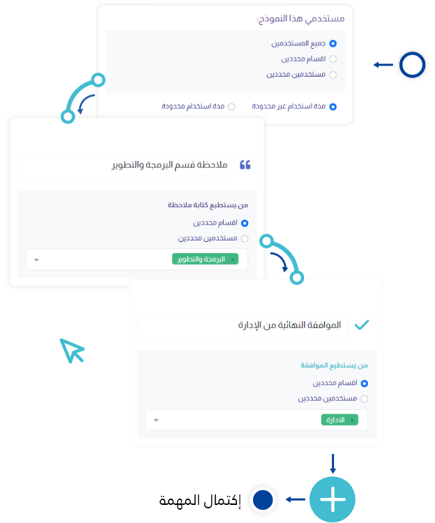 يمكن لمدير النظام ان يحدد خط سير المهمة من خلال توزيع خطواتها على أفراد الفريق والعاملين وصلاحيات ومهام كل منهم وتحديث المطلوب إجراؤه من كل فرد منهم إما فقط بالموافقة أو الرفض أو إدخال نص بملاحظات أو توصيات
